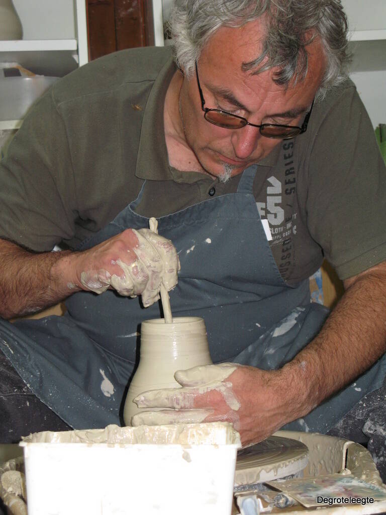Meer dan 30 jaar geleden ben ik in contact gekomen met een pottenbakker. Daar heb ik de eerste potten zien draaien. Het fascineerde mij hoe soepel de klei op en neer ging en dan plots vorm kreeg.